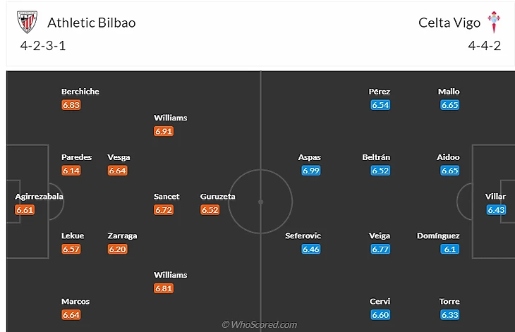 Ну а что касается футбольных дел, то тут главная головная боль басков - в центре обороны. ПРопускают ближайший тур травмированные Йерай Альварес(5,5) с Иньиго Мартинесом(6) и не очень понятно успеют ли вернуться в строй не до конца здоровый Весга(6). А вот Ренато Тапия(6) и Яго Аспас(8) точно выезд в Бильбао пропустят. У перуанского опорника перебор желтых карточек, а у форварда - проблемы с коленом.