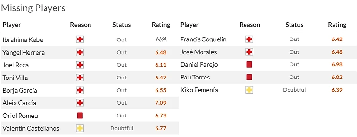 Что касается более практических вещей, то не поедут в Каталонию дисквалифицированные Парехо(7,5) с Пау Торресом(6) и травмированный Альбиоль(5,5) .