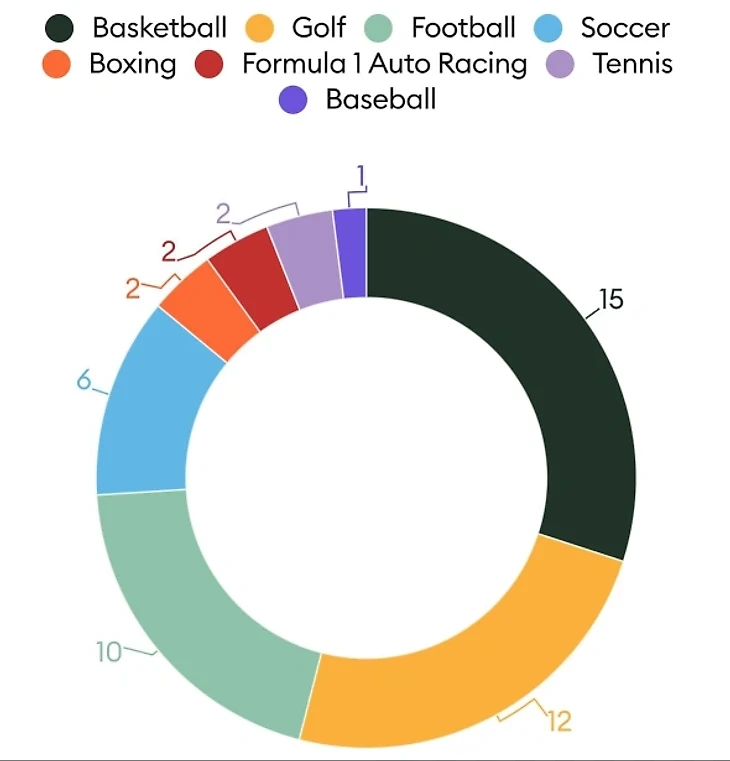 Большинство участников рейтинга — игроки Национальной баскетбольной ассоциации (15 спортсменов), в прошлом году их было 18. Также в топ этого года вошли 12 гольфистов. Именно в этих видах спорта одни из самых дорогих спонсорских контрактов. Кроме того, есть в списке представители футбола (10), регби (6), бокса (2), автогонок «Формулы-1» (2), тенниса (2) и бейсбола (1).
