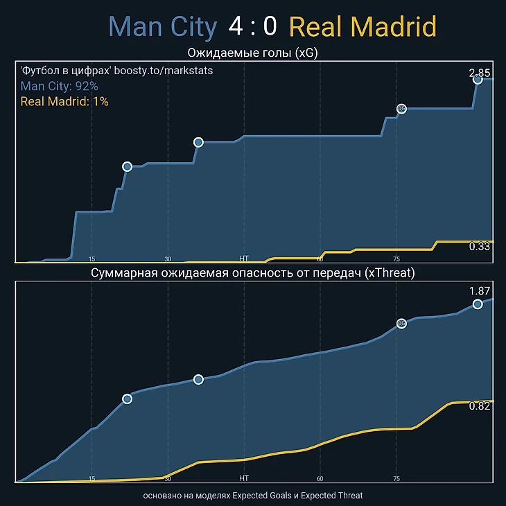 Дайте «Реалу» чуть-чуть воздуха, маленькой передышки, и они ей воспользуется. «Сити» не дал. Они вымотали их в первом тайме, а во втором просто добили. Интенсивность первого была настолько высокой, что во втором устало выглядели даже игроки «Сити» – атлетичные и молодые киборги.
