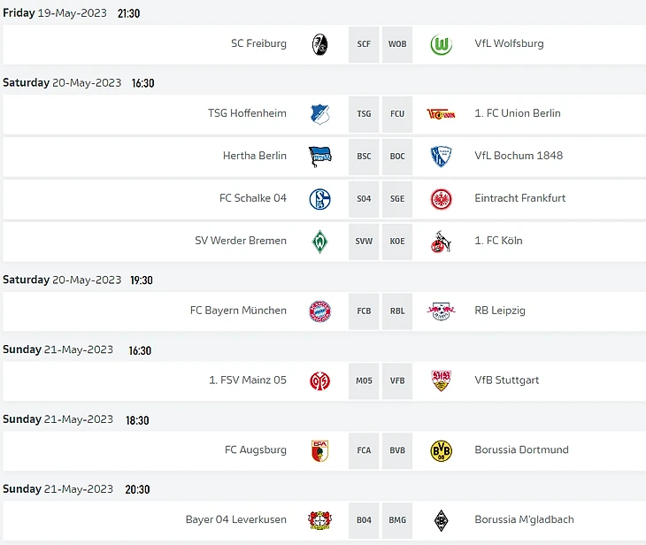 Чемпионат буквально на финишной прямой, предпоследний тур, и через неделю мы узнаем имя нового (или нет) обладателя серебряной салатницы. В этом туре нас ожидает ожесточенная схватка за последние свободные места в еврокубках и ужасающая по своему накалу борьба за право остаться в первой лиге. Центральная встреча: матч «Баварии» и «РБ Лейпциг» в субботу вечером, в пятницу же тур откроют претенденты как минимум на Лигу Европы и Лигу конференций «Фрайбург» и «Вольфсбург». В воскресенье сразу три матча: среди них выезд «Боруссии» из Дортмунда в Аугсбург, а разница между Мюнхеном и Дортмундом в таблице всего один балл, любая ошибка может стоить чемпионства...