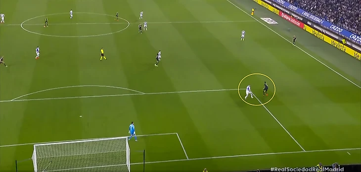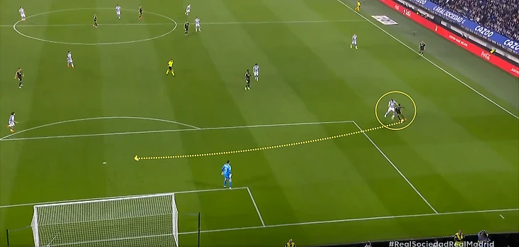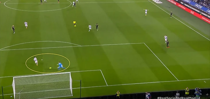 Вот пример. Запрессинговали Милитао и вынудили того делать пас вдоль ворот. Эпизод завершился голом Кубо.