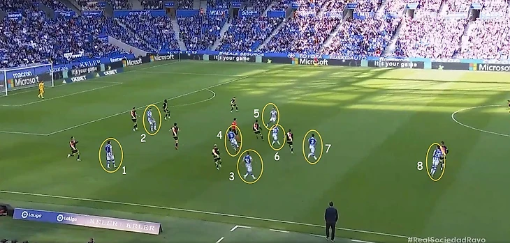 Данная схема позволяет наполнять середину и размещать на поле большое количество креативных футболистов. В составе есть нестареющий Давид Сильва (лучший по продвигающим передачам, 162, и пасам в штрафную, 37), прошедший академии «Барселоны» и «Мадрида» японский талант Такефуса Кубо (третий в лиге по проходам, завершившемся ударом, 29), Браис Мендес, Микель Мерино, Микель Ойарсабаль и ещё много других отличных футболистов.