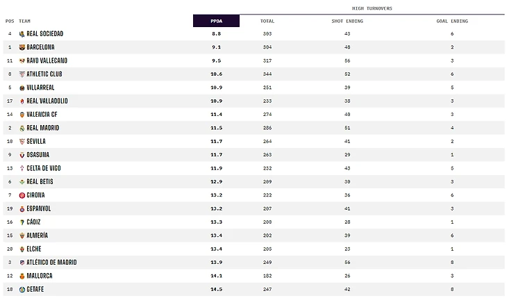 Команда Альгуасиля хороша в обороне: вторые в чемпионате по ожидаемым пропущенным (30.6) и третьи – по реальным (31). Во многом это достигается за счёт качественного высокого прессинга. По интенсивности давления «Реал Сосьедад» – лучший не только в Испании, но и в топ-4 европейских лиг (PPDA = 8.8).