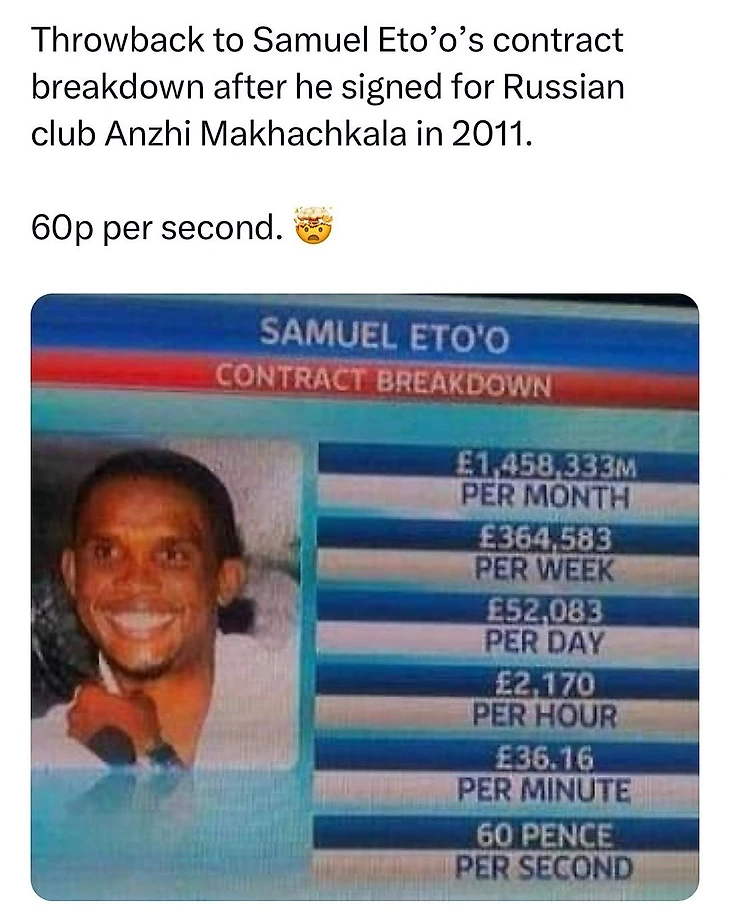 Трансфер суперзвездного камерунца в Махачкалу в 2011 году прогремел на весь мир, а британские журналисты тогда выяснили, что Сулейман Керимов выписал ему чек на 18 млн фунтов в год.