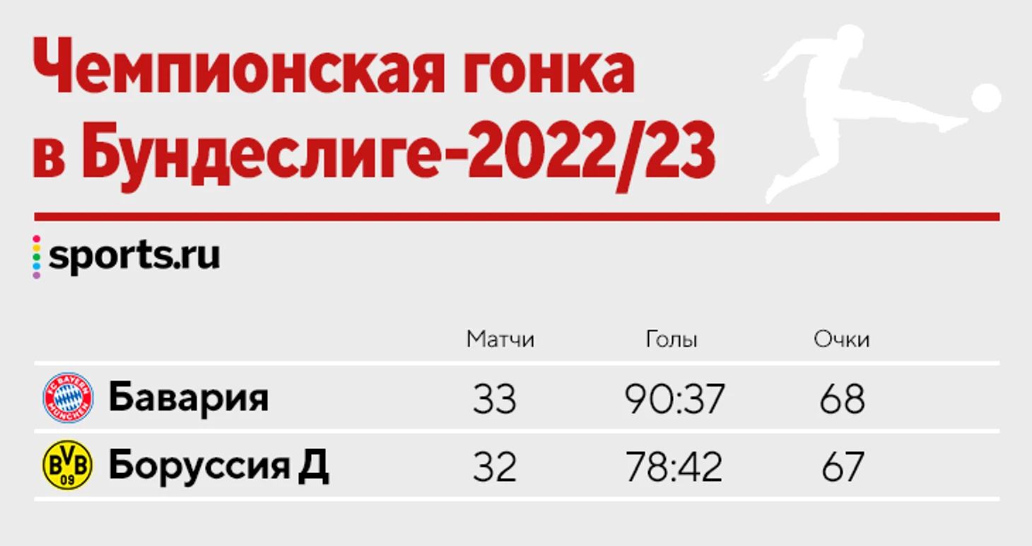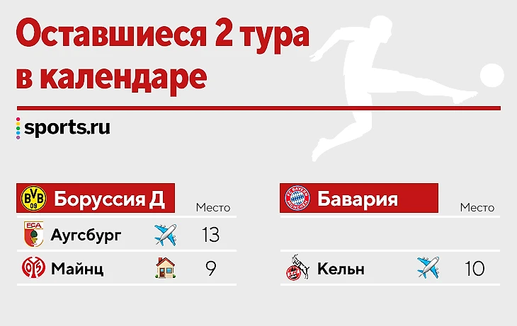 Всего тур назад статистическая модель FiveThirtyEight оценивала шансы «Баварии» в 76%, но теперь у мюнхенцев всего 41%. Да, модель верит в «Боруссию» – 59%. У остальных шансов нет.