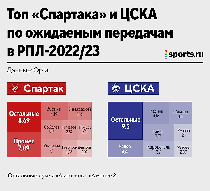Интересная деталь: в ЦСКА вклад ассистентов распределен равномерно, тогда как в «Спартаке» есть Промес и все остальные.