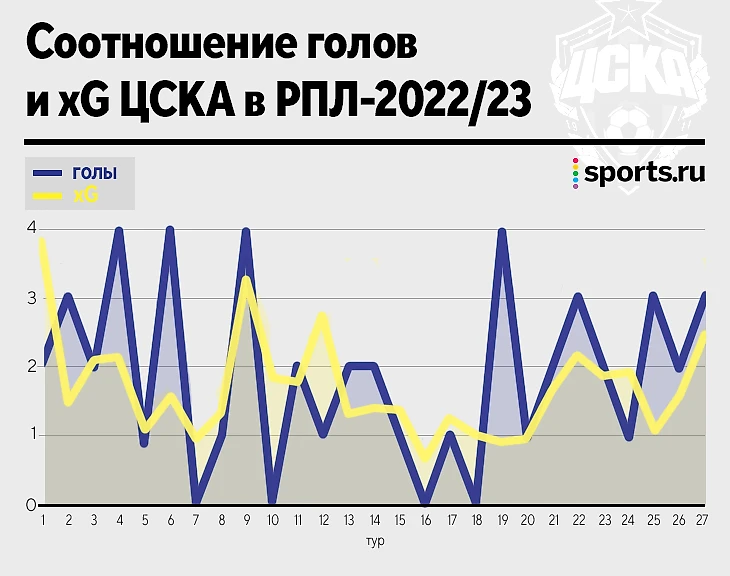 У ЦСКА на дистанции сезона – похожая картина. Команда Федотова много создавала и реализовывала перед сентябрьским перерывом на сборные: 4 матча с 3+ голами за 11 туров, ближе к зиме – 0, после паузы – снова 4.