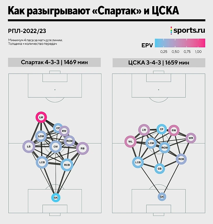 Начнем со схем «Спартака» и ЦСКА. На графике ниже – игровые связи команд РПЛ при построении атак. Все очень просто: точки – усредненные позиции игроков за сезон, линии отражают количество передач (чем толще линия, тем больше пасов друг другу). Цветом выделена EPV – ожидаемая ценность владения. Логика похожа: синий – низкая вероятность, что действие игрока приведет к голу, красный – большая.