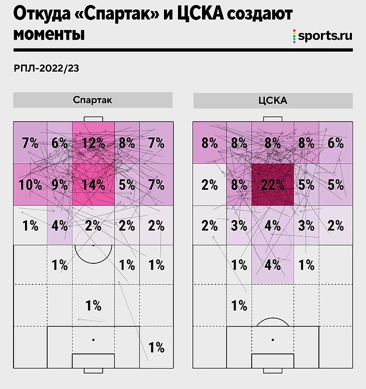 Тактика «Спартака» и ЦСКА в картинках: откуда создают моменты, как забивают и пропускают, кто лучший в атаке