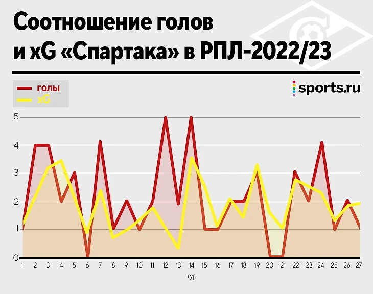 Весной «Спартак» лидирует по xG (20,99) при 18 голах, создает больше, чем осенью, но этого не хватает для побед из-за ужасной обороны (пропустил 18 мячей) и неудачных первых таймов.