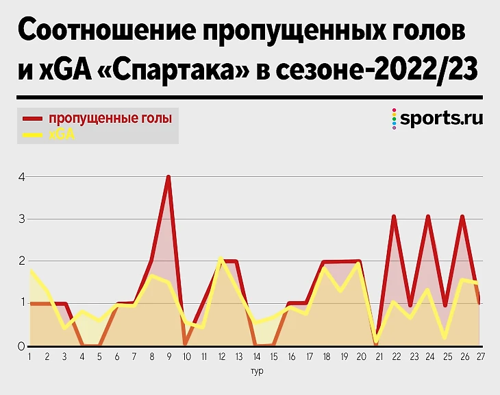 График динамики xGA (допущенный xG) тоже показывает, что «Спартак» рассыпался в защите: в первой части сезона 4 раза пропускал по 2 и больше (17 туров), а весной – уже 6 раз за 10 игр.
