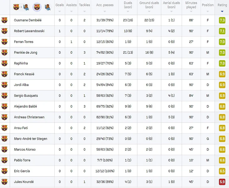 Высший балл в команде получил Усман Дембеле, сегодня продемонстрировавший фантастическое рвение, — у него очень впечатляющая статистика выигранных единоборств. Левандовски тоже заработал хорошую оценку, забив гол на последних минутах матча.