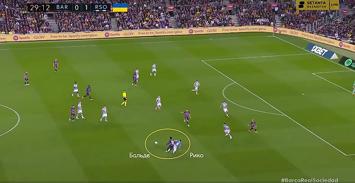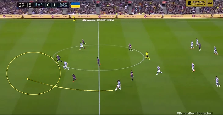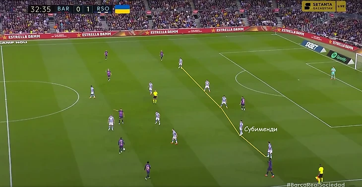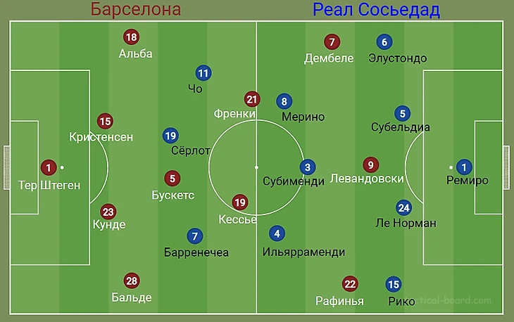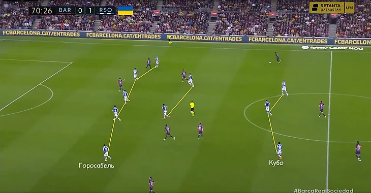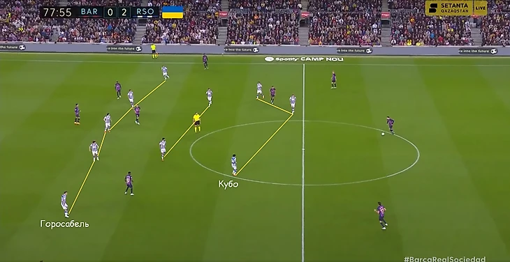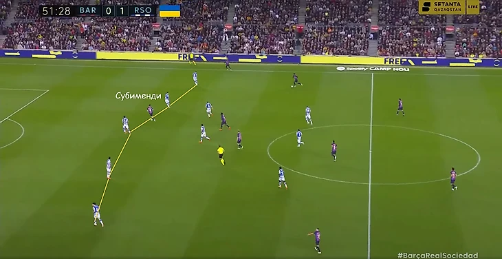 Без мяча пятым в линию часто опускался Мартин Субименди. Не самый лучший матч посмотреть на возможную замену Бускетса, так как «Реал Сосьедад» мало времени проводил с мячом (33%), а именно действия при владении будут ключевым фактором в возможной игре за каталонцев.