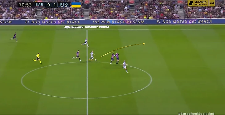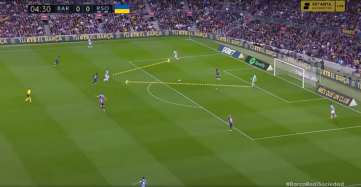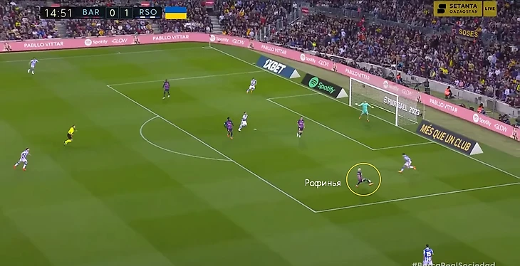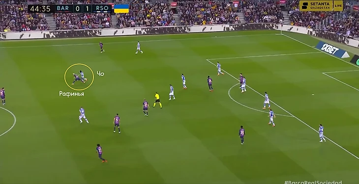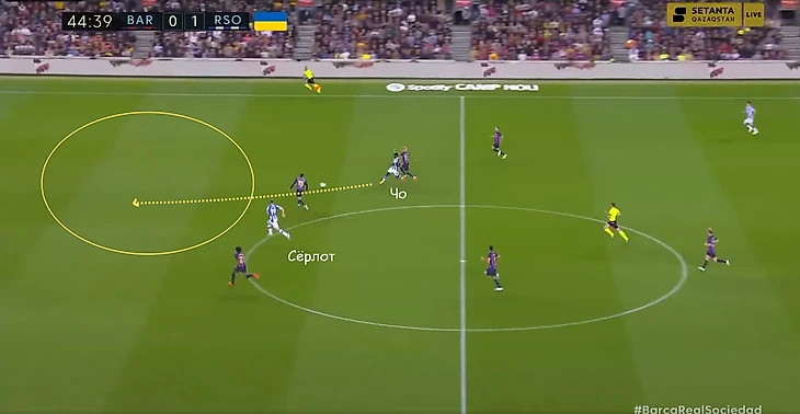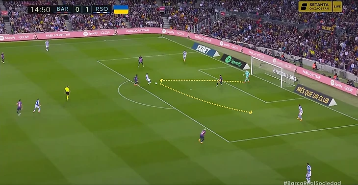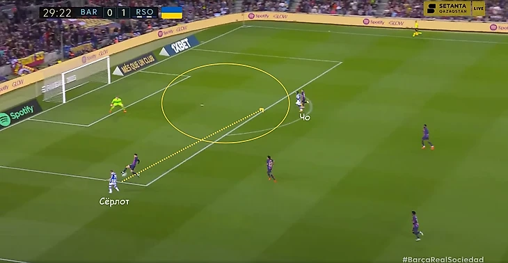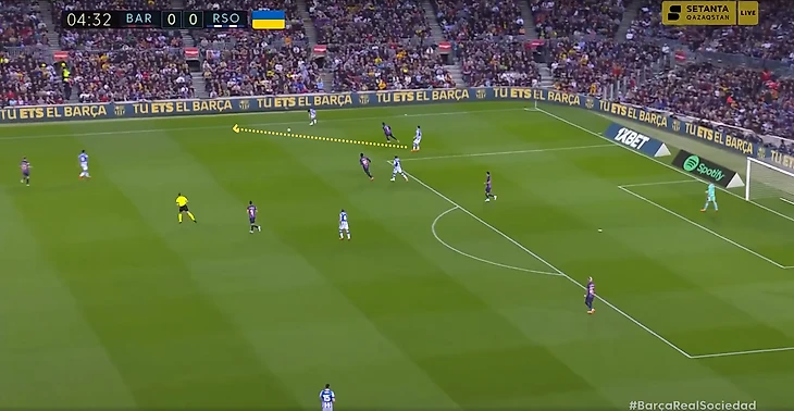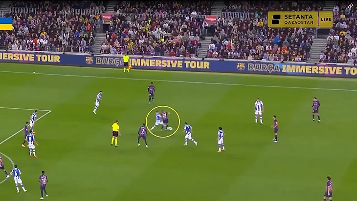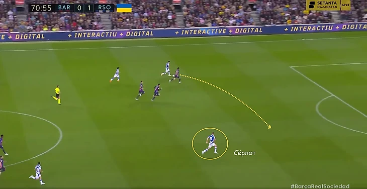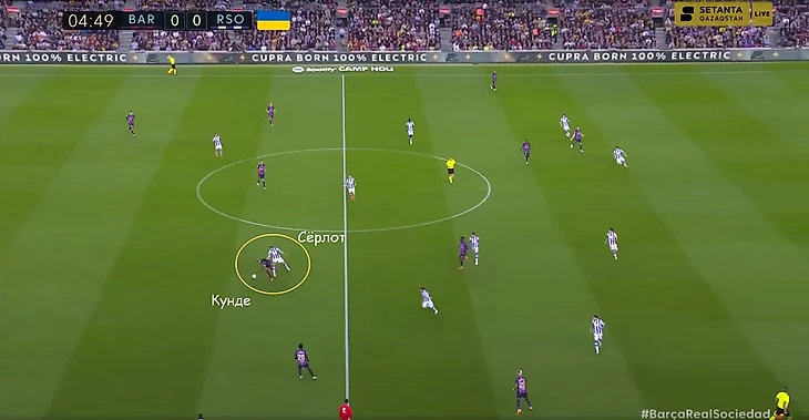 Здесь важно держать в голове тот факт, что «Реал Сосьедад» - самая интенсивно прессингующая команда Ла Лиги (PPDA = 8.8). Во вчерашнем матче из-за быстрого гола и комфортного счёта на протяжении практически всего матча мы не увидели постоянного давления в исполнении гостей, но ситуативно они здорово поджимали «Барсу», что часто приводило к созданию опасных моментов.