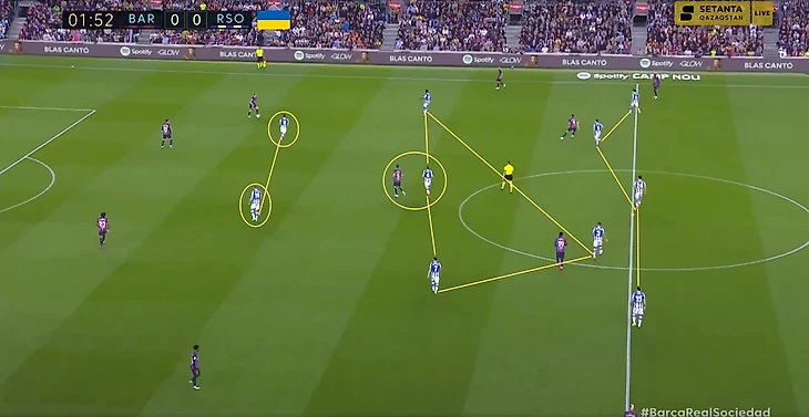 По сезону чаще всего мы наблюдаем ромб в центре поля у «Реал Сосьедада». Данная формация позволяет наполнить состав большим количеством креативных футболистов и предоставить им возможность взаимодействовать. Вчера главной задачей было противодействие «Барсе». У гостей прослеживалась достаточно гибкая структура прессинга. На позициях могли оказываться разные футболисты. Но базисом оставалась пара игроков в первой линии и кто-то, действующий персонально по Бускетсу.