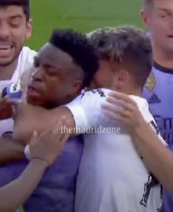 Бразилец и еще несколько игроков побежали к трибуне, Вини активно показывал на кого-то пальцем и злился. Игроки «Валенсии» пошли к трибунам. Успокаивать Вини пришлось даже Карло Анчелотти – на табло сразу вывели надпись: «Валенсия» выступает против насилия и оскорблений в футболе».