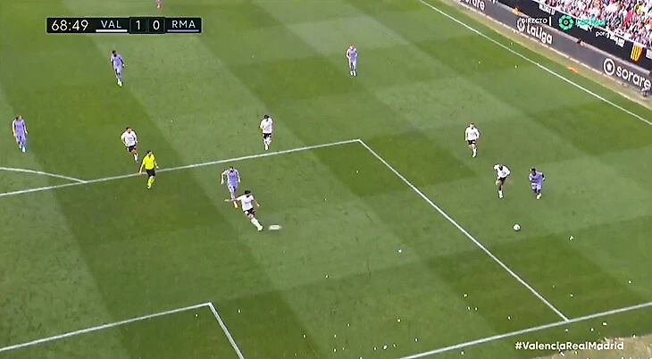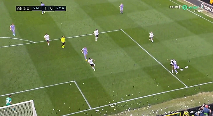 Перед этим случился еще один странный эпизод: во время атаки «Реала» на поле оказалось два мяча – второй явно вбросили с трибуны «Валенсии». Именно в тот момент Винисиус прорвался в атаку – защитник Эрай Джемерт взял и пульнул выкатившийся мяч... в игровой.