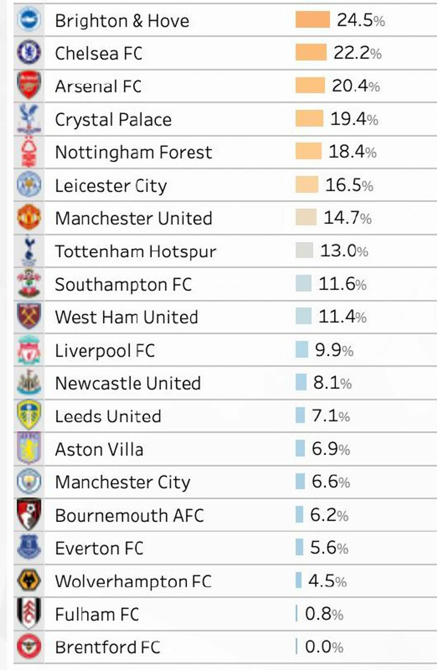Любопытная диаграмма. Отражающая долю минут, проведенных «доморощенными» (находившимися в системе клуба хотя бы три года в возрасте от 15 до 21) игроками, от всего доступного в сезоне АПЛ времени, она была запущенна в твиттер как едкий укол Гвардиоле: в одном из дебютных интервью в «Сити» Пеп обосновывал выбор клуба мощью его академии. Но искренне цепляет здесь, конечно, верхняя строчка.