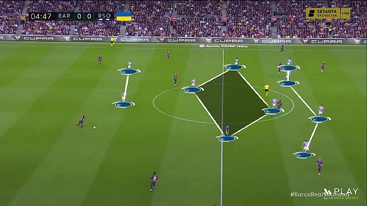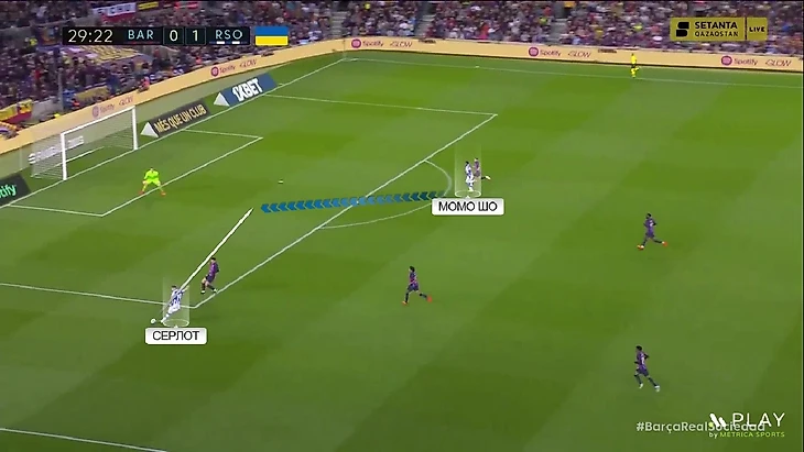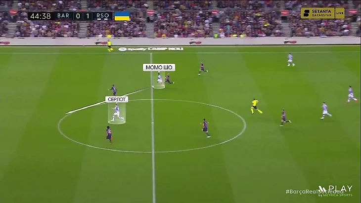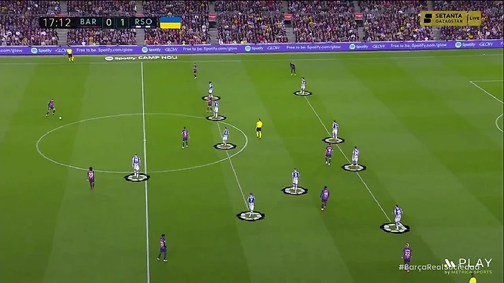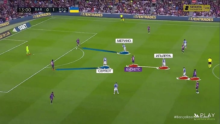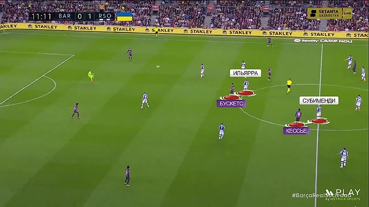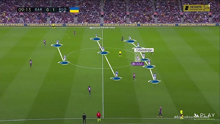 Новое наполнение схемы – это попытка как улучшить игру в прессинге «Сосьедада», так и вписать в неё быстрых игроков для игры на контратаках – Барренечеа и Момо Шо. В этой формации принцип прессинга остался таким же. Ромб смещается по мячу и запирает соперника, когда мяч идёт во фланг. Покажу наглядно – здесь «Барселона» разыгрывает мяч от ворот и расположение «Сосьедада» стандартное: Сёрлот и Мерино давят на центральных защитников, Ильярраменди играет с Бускетсом, а Субименди с Кессье: