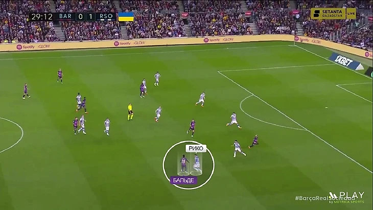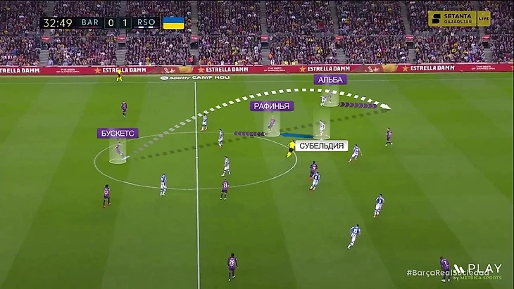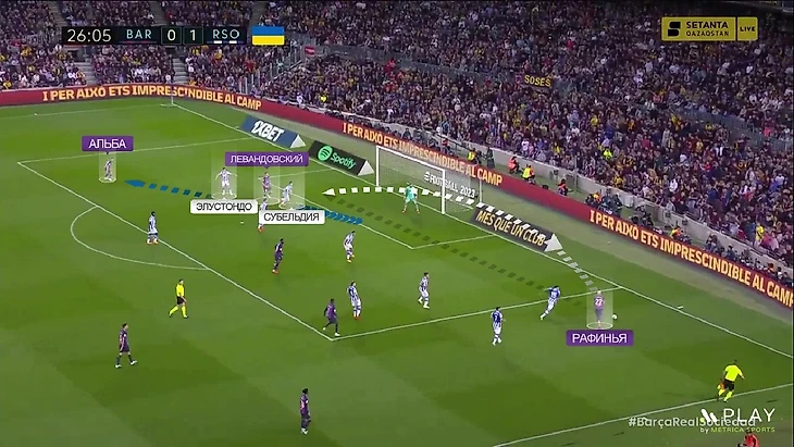 Но Рафинья слева в атаке выглядел не сказать, чтобы лучше. Это довольно странно – в отличие от Дембеле, бразилец является более дисциплинированным игроком, но его движение на неродной позиции далеко не всегда было полезным. Вот положительный пример – Рафинья оттягивается назад, уводит за собой Субельдию, а в пустую зону открывается Альба, и Бускетс делает на него заброс: