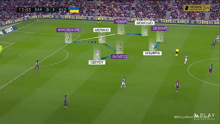 Но когда Кристенсен отдаёт Альбе на фланг, Ильярраменди переключается с Бускетса на де Йонга, Момо Шо играет с Альбой, а Мерино сразу закрывает два направления – на Кристенсена и Бускетса (при этом по Серджи ещё может и Сёрлот сыграть). Получается что-то вроде 1-в-1 на маленьком участке поля: