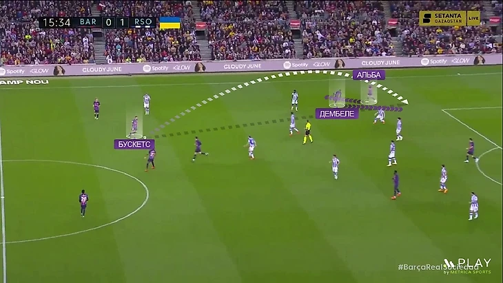 «Реал Сосьедад» действительно неплохо сдерживал «Барсу», но нельзя сказать, что в позиционной обороне команда действовала безупречно. Например, часто оставляли свободными игроков защитников и Бускетса (а это не лучшая идея). К тому же впереди игроки «Барсы» способны подбирать нужный тайминг для открываний. Вот пример такой ситуации – Бускетс получает полную свободу, Альба на левом фланге оттягивается назад, а Дембеле наоборот – открывается за спину в этой же зоне. Это запутало защиту: