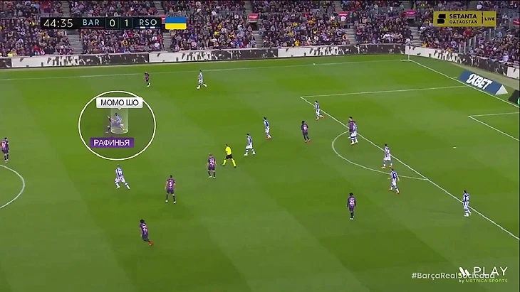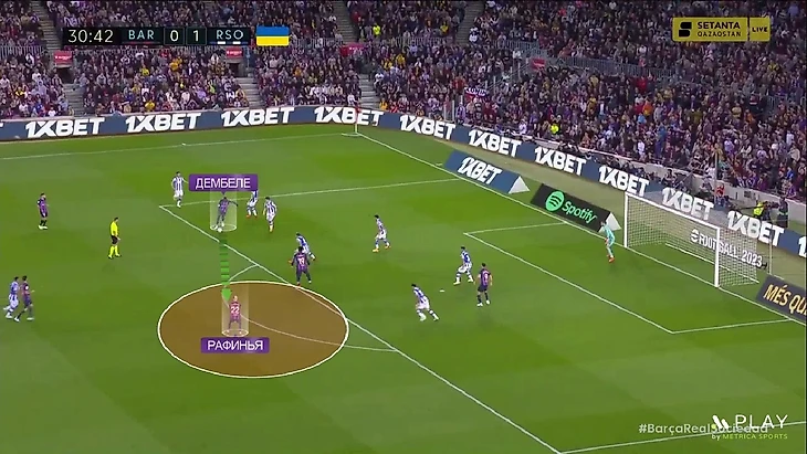 И ещё одна проблема – Рафинья и Дембеле вместе на поле. Если посмотреть на расположение «Барсы» впереди, то увидим, что слева ширину выдерживает Альба. Значит левый вингер должен смещаться в центр, сдваивать центр атаки, освобождая бровку Альбе. Ферран и Фати подходят под эту роль, а вот по поводу Дембеле есть вопросы. У него были неплохие моменты в этой зоне (один из таких мы уже рассматривали), но мы не увидели цельности. Усман постоянно шёл в обводку (19 попыток, 10 успешные – невероятные цифры), но далеко не всегда в опасных зонах. К тому же впереди принимал не самые правильные решения. Вот яркий пример – сначала Дембеле просто уничтожает Элустондо 1-в-1, но затем вместо очевидного паса под удар Рафинье просто жадничает и теряет мяч: