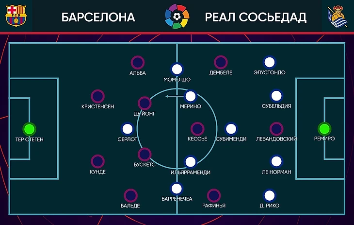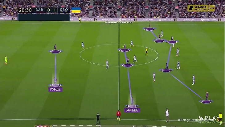 Но в матче с «Сосьедадом» Хави решил изменить структуру на более смелую – 2-3-5. В этот раз Кунде играл в паре центральных защитников, а Бальде не оставался как дополнительный центральный:
