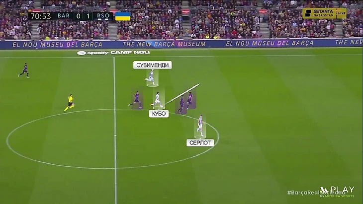 Этот ход – хороший ответ на пятёрку впереди, которую любит использовать «Барселона» (до этого мы ещё доберёмся). Франк Кессье как раз активнее всех из полузащиты шёл в переднюю линию, поэтому опускания Субименди здесь оказались очень кстати.