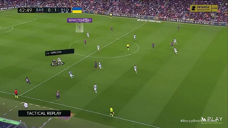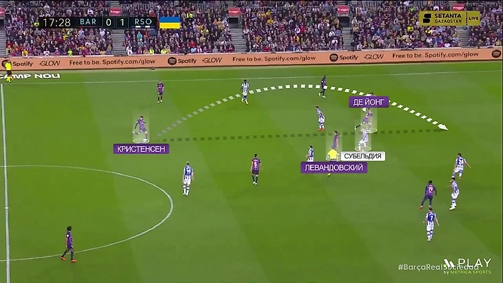 Ещё один эпизод – в этот раз Кристенсен получил свободу, впереди здорово сыграли де Йонг и Левандовский: поляк оттянулся глубже и за ним пошёл Субельдия, а затем подсказал Френки, чтобы тот врывался в открывшуюся зону: