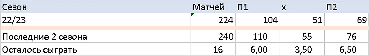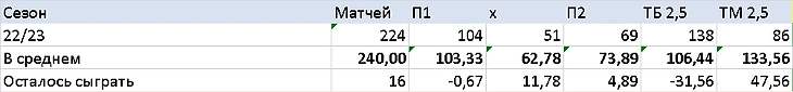 Дальше я решил посчитать, а сколько осталось добрать исходов текущему сезону, до средних значений предыдущих?! Ведь это важно, так как выборка по историческим данным большая, бывает что сезоны отличаются друг от друга, но история обычно не ошибается никогда.