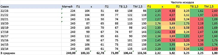 В самом низу таблицы, есть строчка - В СРЕДНЕМ. Она рассчитывается среднее количество исходов за все сезоны, кроме текущего. Я специально так сделал, чтобы было удобно сравнивать текущий сезон с предыдущими.