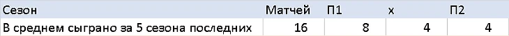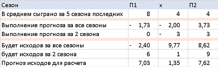 Для расчета исходов я решил взять по факту средние значения, которые были в последних 2 турах за последние 5 сезонов. Вот таблица, которая была выше.