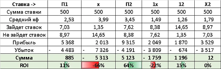 По таблице видно, что при ставке П2 на все матчи оставшихся туров, средняя прибыль при ставке 500 рублей, будет в районе 64% по ROI.