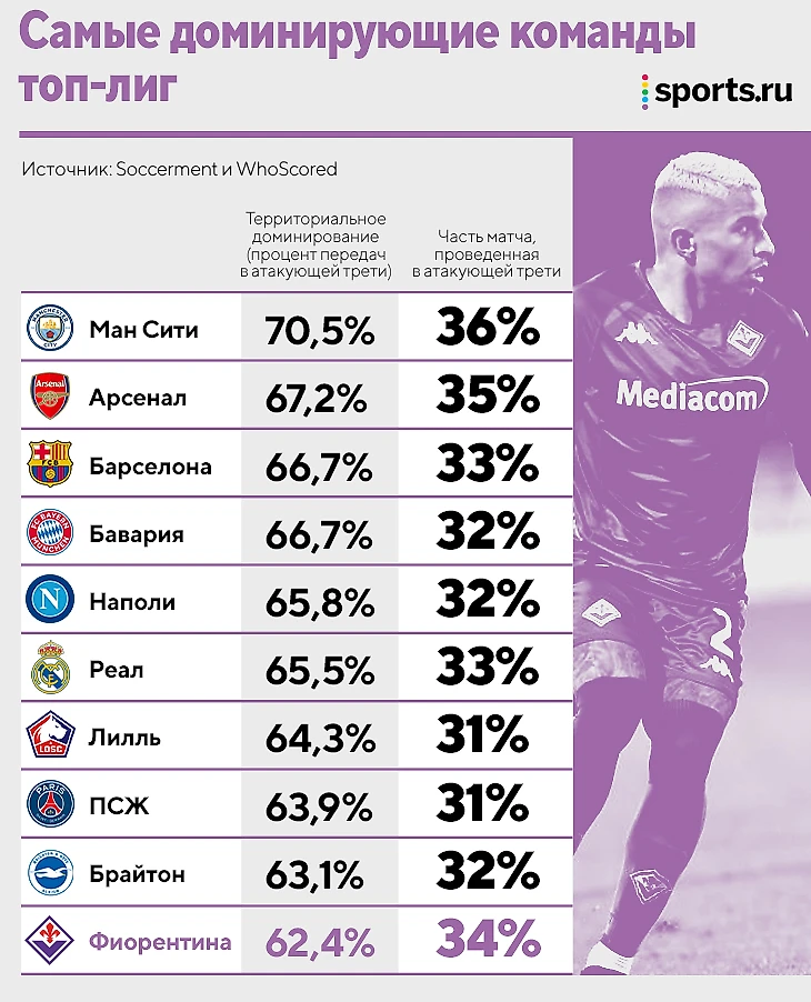 «Фиорентина» это доказывает. Клуб входит в десятку самых доминирующих команд топ-лиг – контролирует мяч в продвинутых зонах, а не на своей половине. Еще выразительнее доля игры, которую флорентийцы проводят в атакующей трети – 34%. Они третьи на континенте после «Ман Сити» и «Арсенала». Разница между 10-м местом во владении и 3-м вообще подчеркивает качество контрпрессинга: даже без мяча Итальяно запирает соперника возле штрафной.