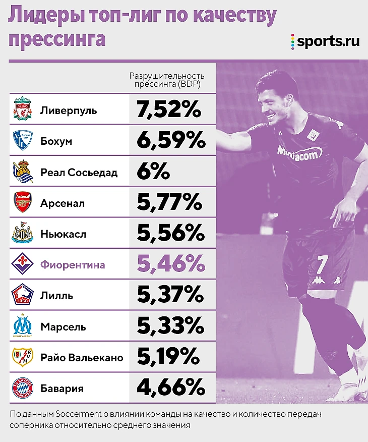 Еще сильнее она выделяется в интенсивности (первая в лиге) и качестве прессинга. Soccerment высчитывает разрушительность давления по тому, насколько сильно снижается количество и точность передач соперника относительно его среднего значения. «Фиорентина» входит в шестерку лучших в Европе. В Серии А никто не прессингует настолько качественно.