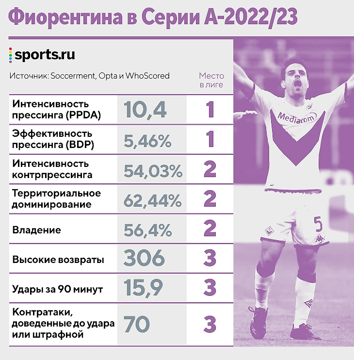 Флорентийцы компенсируют открытость мгновенной агрессией. Бывший аналитик сборной Антонио Гальярди разработал метрику, которая подсчитывает активность контрпрессинга по доле попыток в первые 6 секунд после потери. «Фиорентина» уступает только неаполитанцам.
