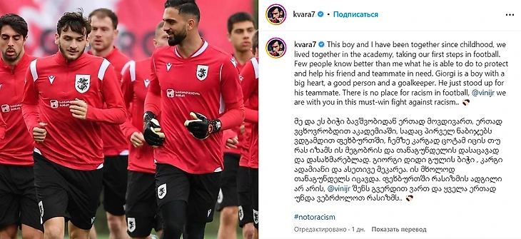 «Мы с этим парнем знакомы с детства, вместе жили в академии, где начинали играть в футбол. Мало кто лучше меня знает, что он готов сделать, чтобы защитить друга и товарища по команде. Георгий – парень с большим сердцем, он хороший человек и вратарь. Он просто защищал своего одноклубника. В футболе нет места расизму. Винисиус, мы с тобой и мы должны бороться с расизмом вместе».