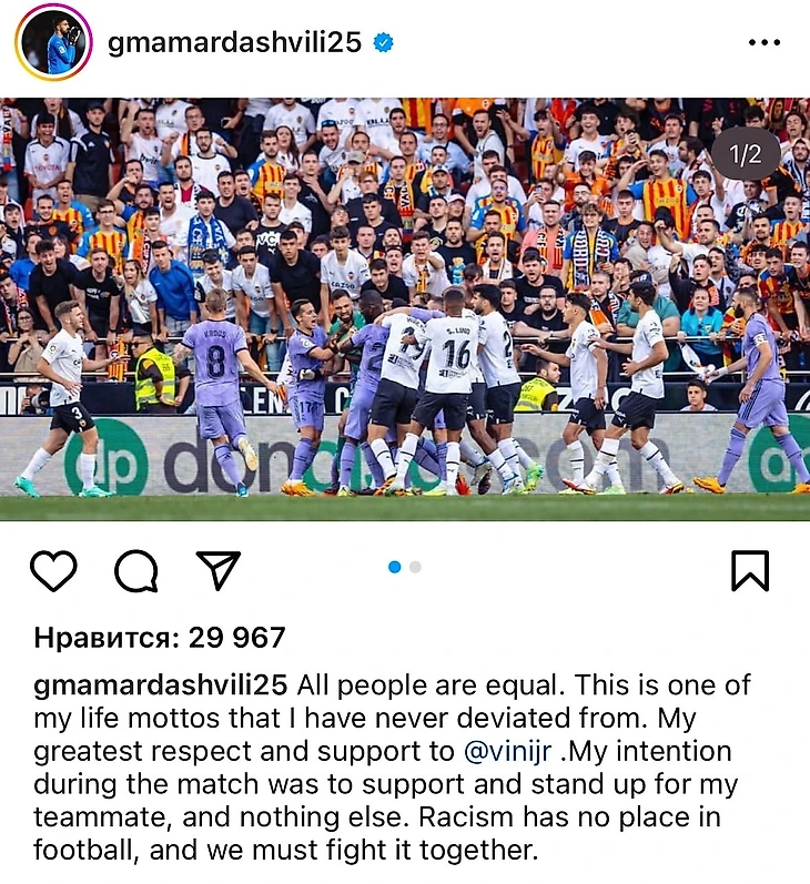 Хоть некоторые поклонники футбола поддержали Мамардашвили, в комментариях грузина продолжили обвинять в расизме. Тогда Георгий опубликовал новый пост, где подробно прокомментировал эпизод в матче против «Мадрида»:
