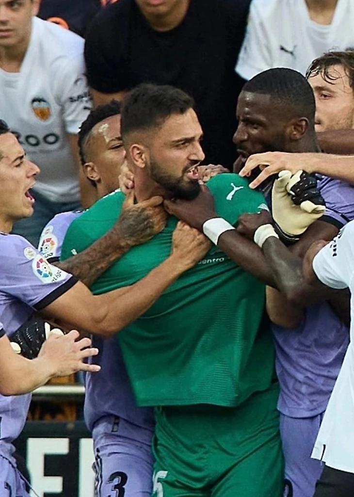 А что в итоге - игроку отменяют красную карточку за удар в лицо, потому что судья, якобы, не увидел что Уго его держал за горло. То есть в нормальном мире: желтые или красные Муса и Рюдигер, плюс должны были дать Уго Дуро 2-3 матча после увиденного и Винисиусу столько же.