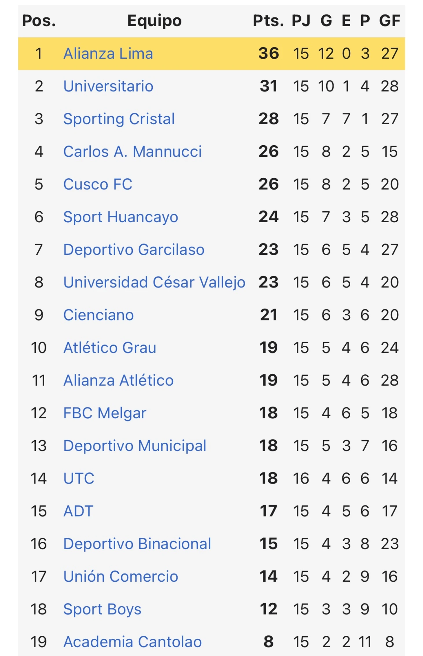 - Альянса Лима на выезде играла против Мельгара. Воскресший клуб из Арекипы показал уверенную игру, с которой снова может претендовать на чемпионство. Однако, слабый старт Апертуры оставляет их в середины таблицы. При удачном раскладе Альянса могла досрочно стать чемпионом первой части чемпионата, однако тренер Гильермо Салас решил поберечь игроков перед важным матчем в Кубке Либертадорес. В Арекипу не полетели Карлос Замбрано и Джосемпир Байон. В итоге, в равной игре победу голом в добавленное время вырвал Мельгар.