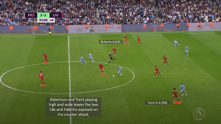Теперь «Ливерпуль» зачастую оставляет тройку игроков сзади: Робертсон остается играть левого центрального защитника вместо того, чтобы подниматься высоко по флангу. Трент формирует пару с Фабиньо в опорной зоне. Таким образом, в моменты перехода мяча практически всегда соперников готовы встречать три защитника и два полузащитника.