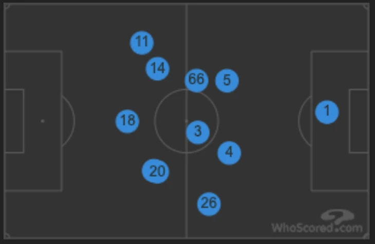 Трент и Фабиньо сформировали отличную пару в полузащите и дали «Ливерпулю» качественную базу как для атаки, так и для обороны. Вы можете заметить это по карте усредненных позиций: