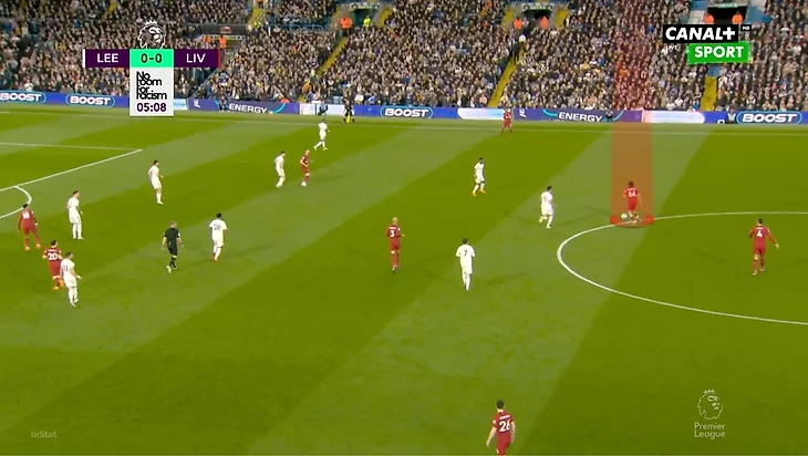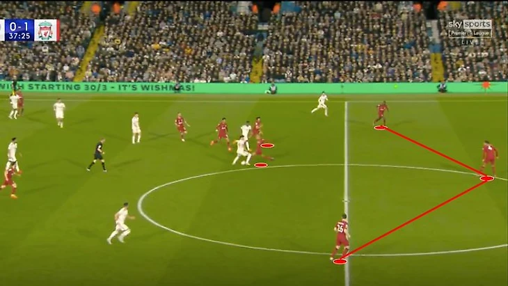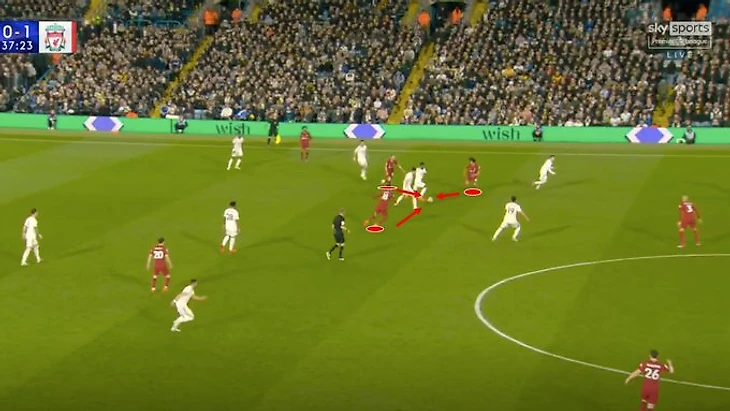 Этот кадр показывает эффективность построения 3-2 в обороне. Трент и Фабиньо вместе возвращают мяч. Но, что еще важнее, даже если бы «Лидс» вышел из-под прессинга в этой ситуации, у «Ливерпуля» сзади была бы подстраховка из трех человек, а не двух, как раньше.