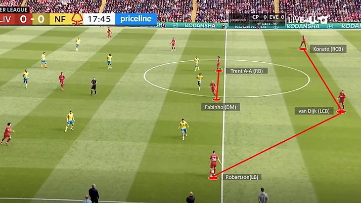Конате в целом здорово вписался в эту роль: он быстрее, сильнее и гораздо лучше защищается в ситуациях 1-в-1, чем Трент. Сам Александр-Арнольд теперь может сосредоточиться на игре на опережении (здесь ему помогает его выдающееся чтение игры) в переходных фазах, а при позиционной обороне он возвращается на привычную позицию правого крайнего защитника.