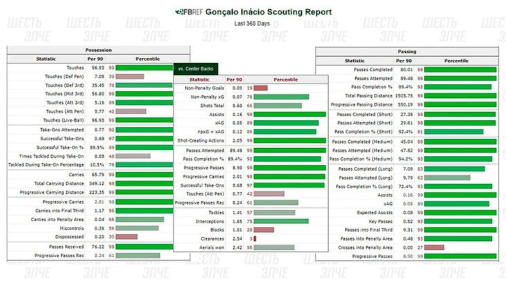 Важное качество, которое точно пригодилось бы в этой роли – умение Инасиу продвигать мяч. Он совершает 8.9 прогрессивных пасов и 2.01 продвижений мяча на дриблинге в среднем за 90 минут. По этим показателям он находится в 99-м и 98-м перцентиле среди центральных защитников.