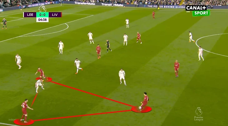Новая структура весьма эффективна и в контрпрессинге, что отмечал и сам Юрген Клопп. Увеличение количества полузащитников позволяет «Ливерпулю» иметь численное преимущество в центре, которое важно в моменты потери мяча. Ниже – пример подобного момента в матче с «Лидсом».