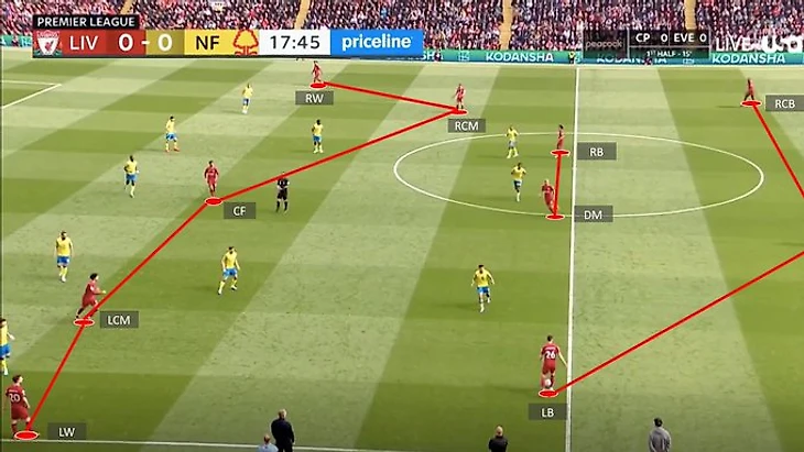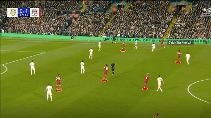 Здесь Салах получает мяч у боковой линии справа. Жота (левый вингер) и Джонс (левый центральный полузащитник) меняются позициями, поэтому Диогу занимает место в полузащите вместе с Гакпо, который действует глубже в роли ложной девятки.