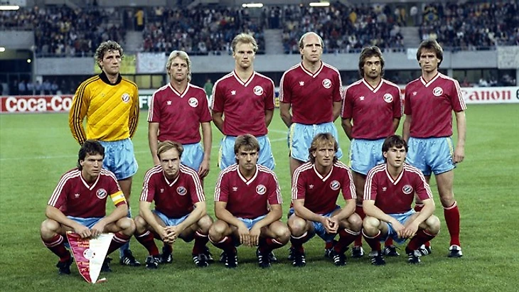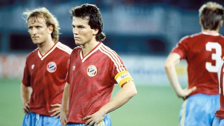 Вот состав «Баварии», который выставил Удо Латтек на финал. Кого мы тут можем узнать сразу и без подсказок? Конечно же, это легендарный бельгийский вратарь Жан-Мари Пфафф, будущий автор победного гола в финале ЧМ-1990 Андрес Бреме, капитан Лотар Маттеус и 22-летний хавбек Ханси Флик – вот же он, в центре нижнего ряда!